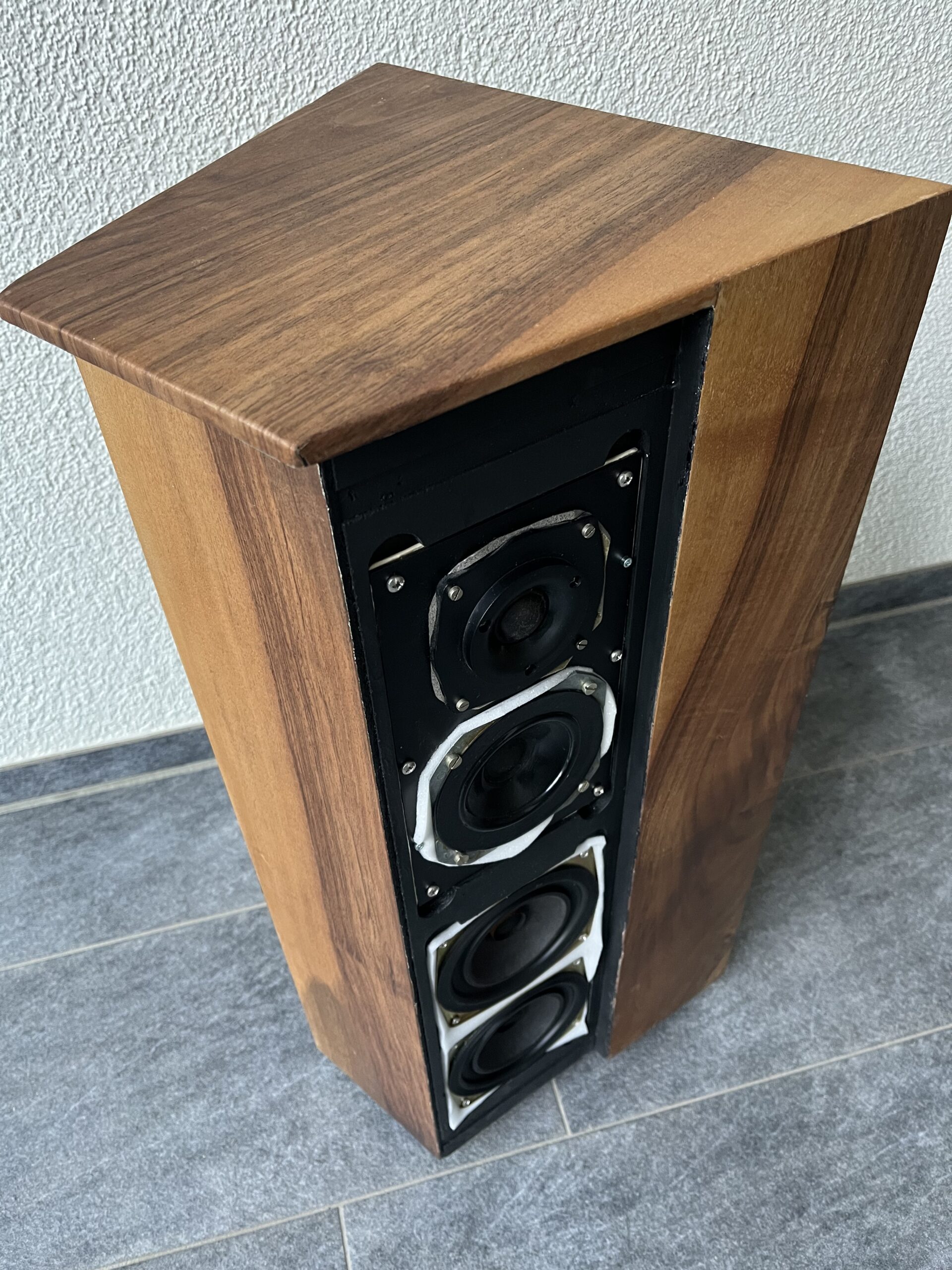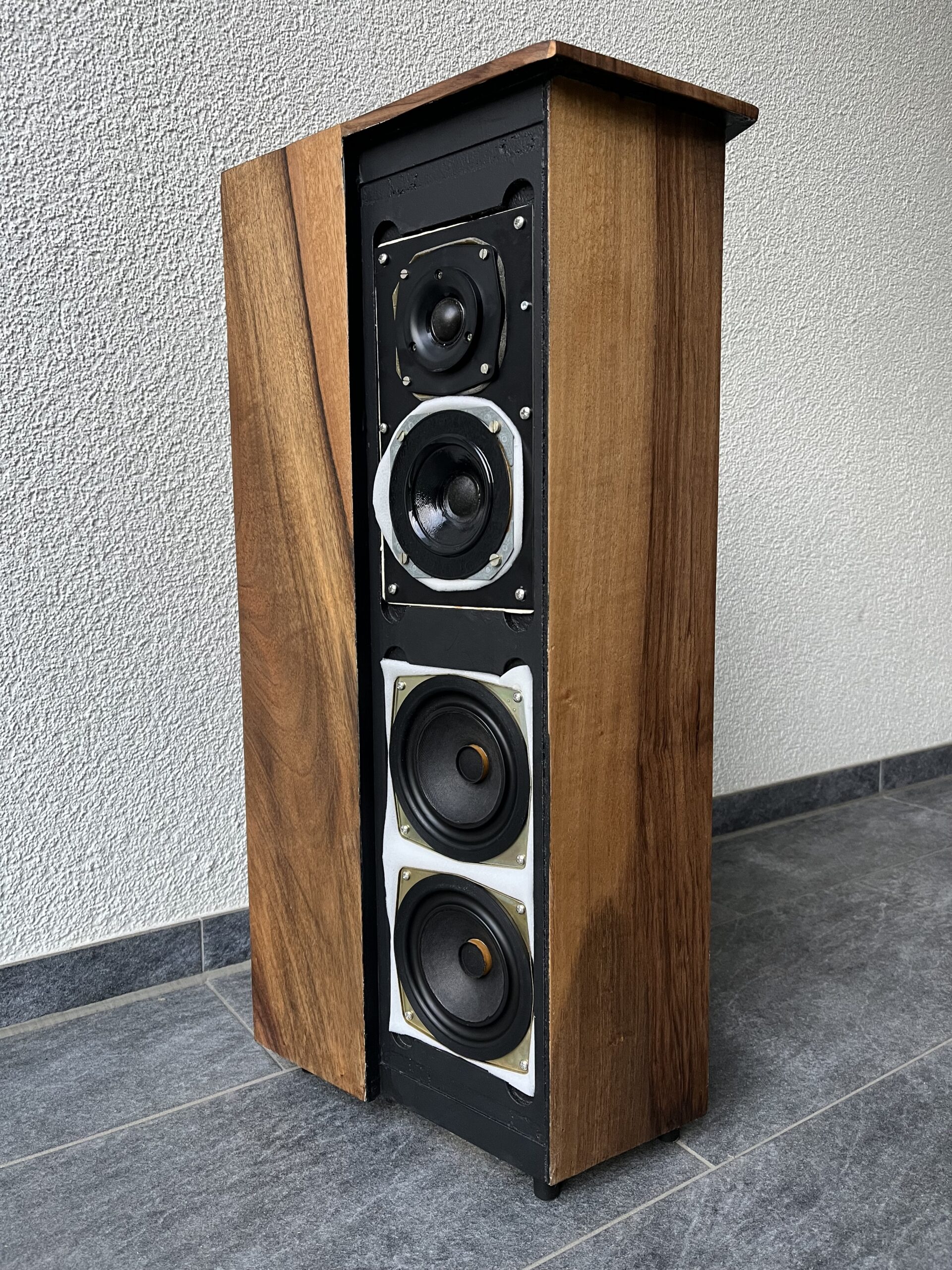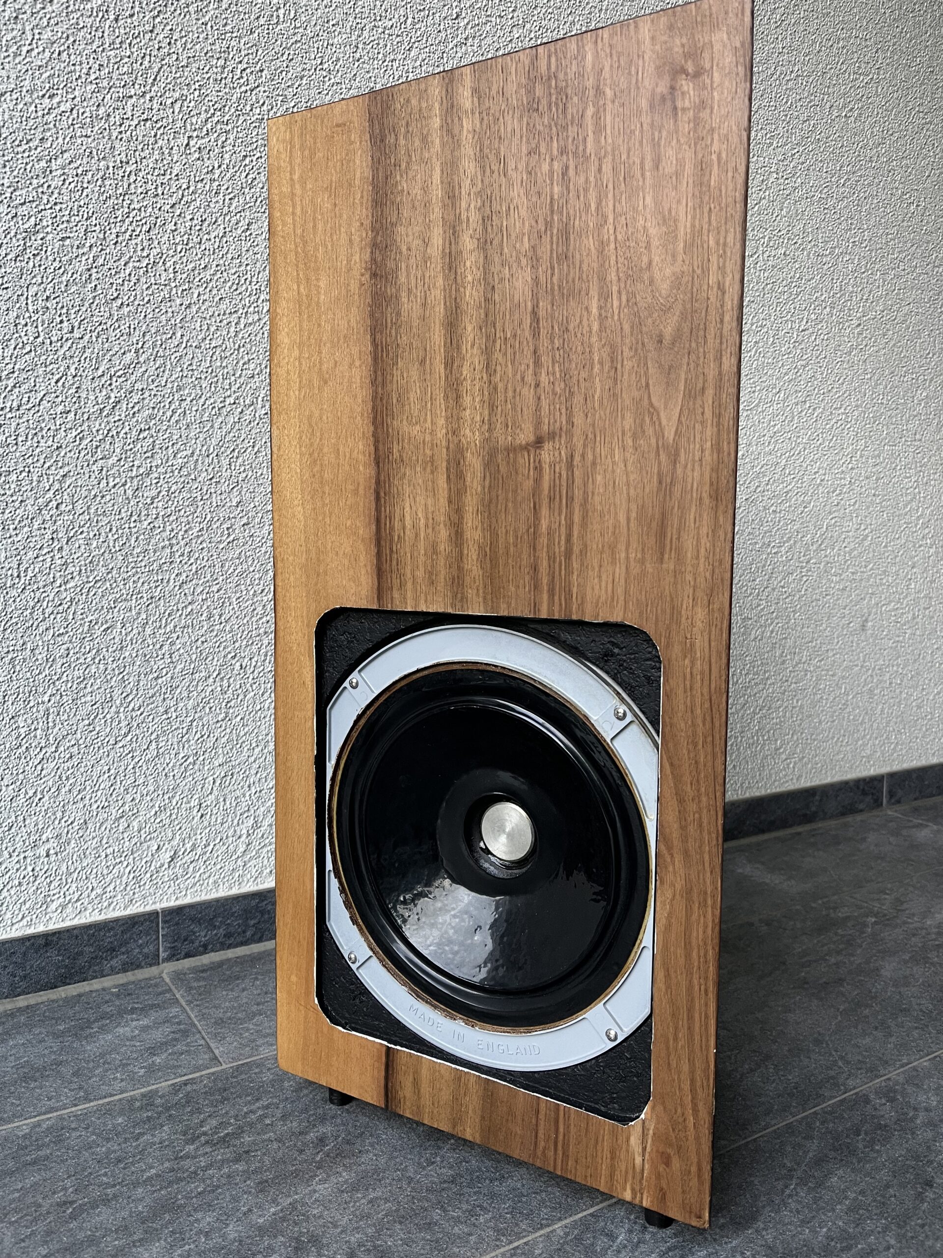 Das Projekt Überarbeitung Goodmans Dimension wurde gestartet. Zielsetzung ein wohnzimmertaugliches Äusseres und eine problemlose technische Funktion. Die Optik sollte mittels Holzfurnier (Nussbaum) erreicht werden, die Höhenproblematik durch einen neuen (gebrauchten) Tweeter ausgebügelt werden (via ebay aus England erledigt). Über das Studium in diversen Foren kam mir der Verdacht, dass nach knapp 50 Jahren vielleicht gar nicht der Tweeter, sondern die Elektronik auf der Frequenzweiche das Problem sein könnte. Beim Betrachten letztgenannter wurde auch offensichtlich, dass der einzige Elektrolytkondensator genau auf den Tweeter abzielt. Ergo wurden zwei (für jede Weiche einer) abgestimmte, hochwertige Ersatzkondensatoren geordert und verbaut.