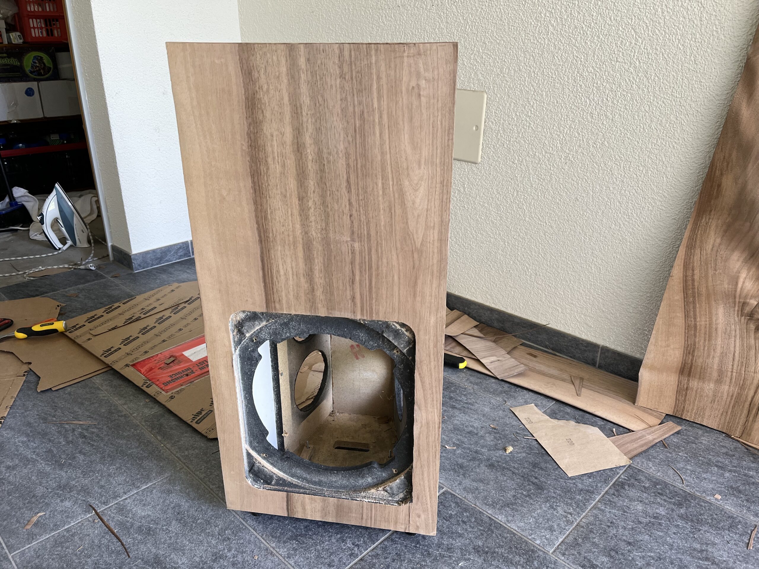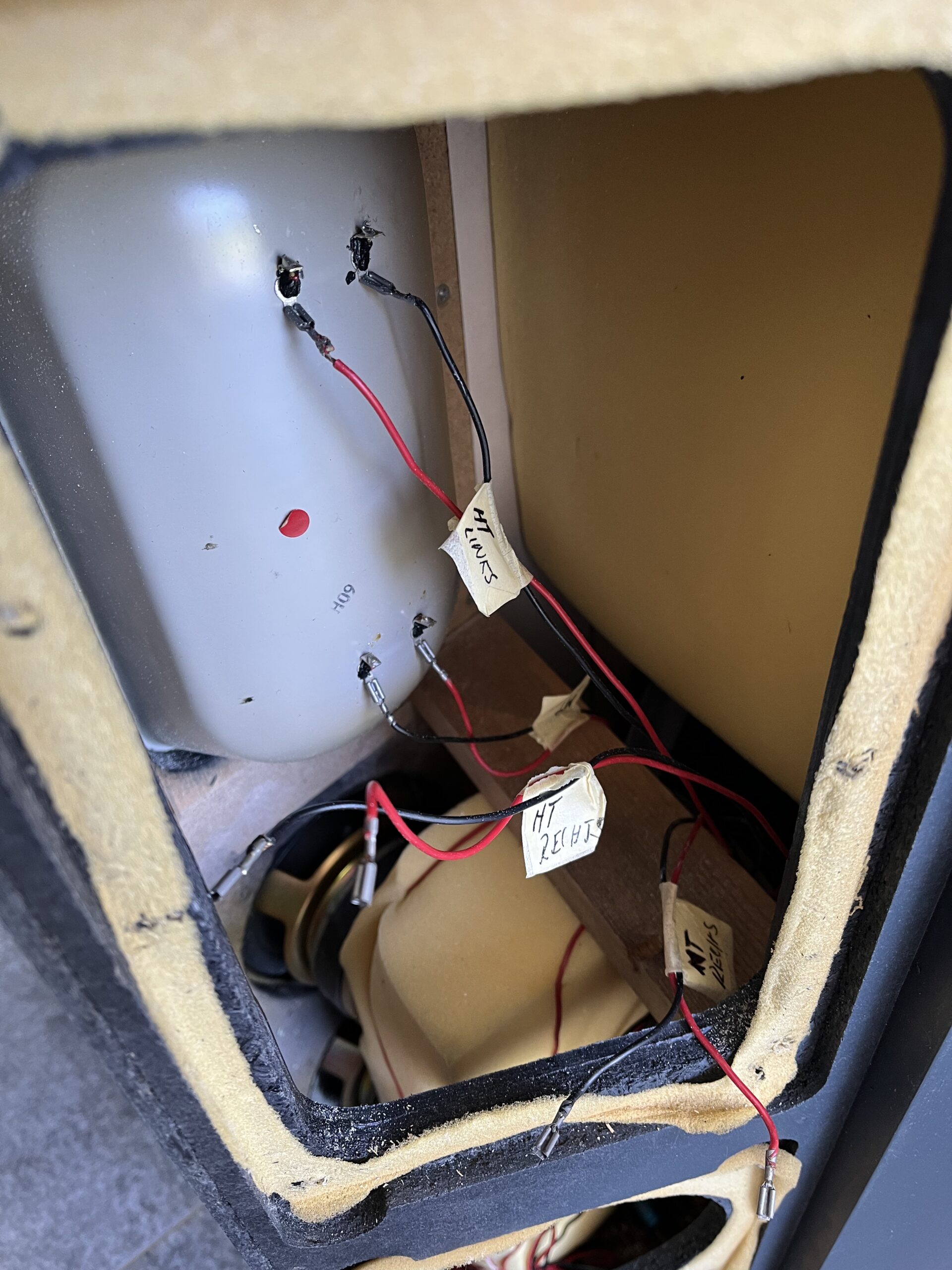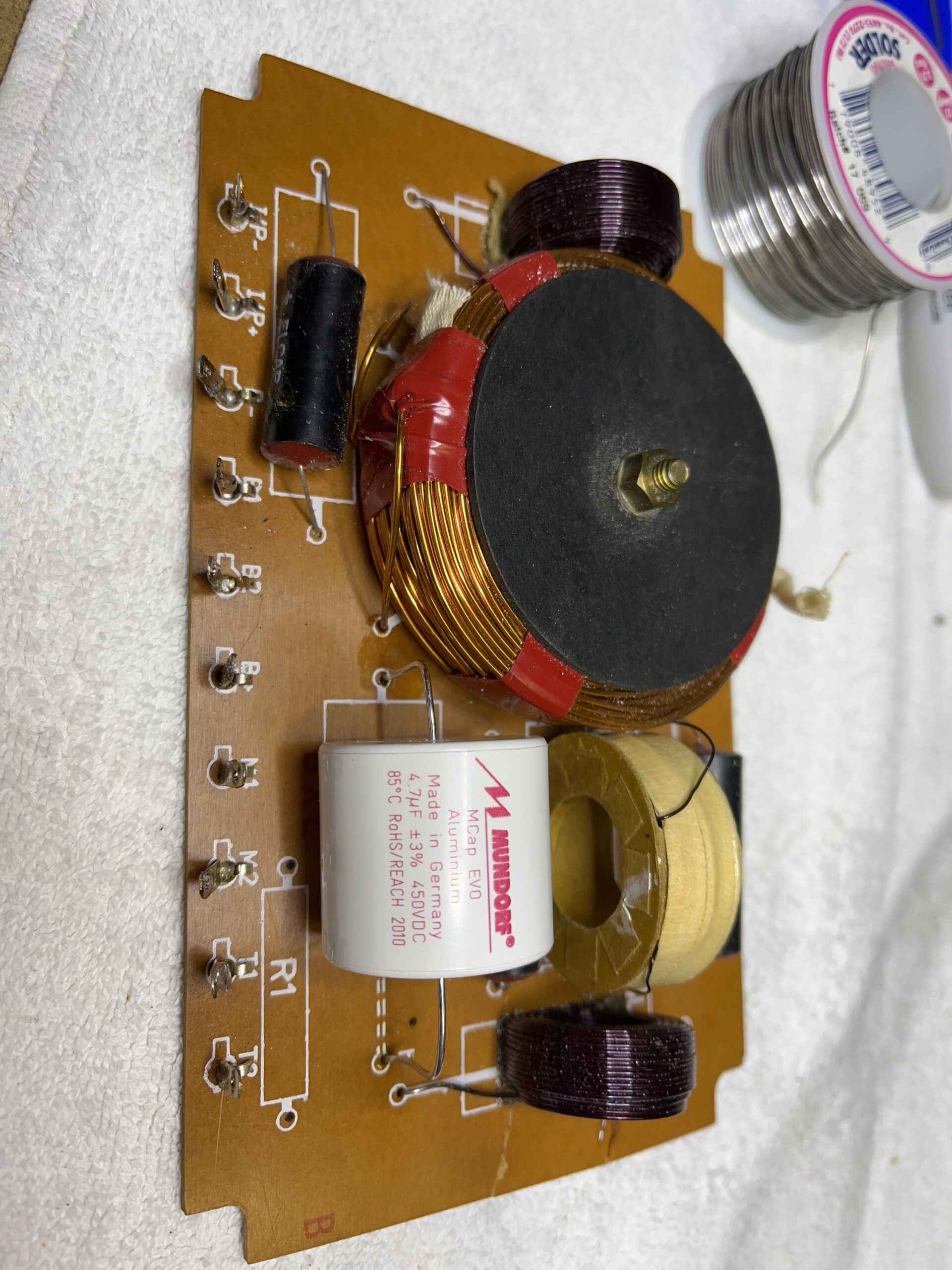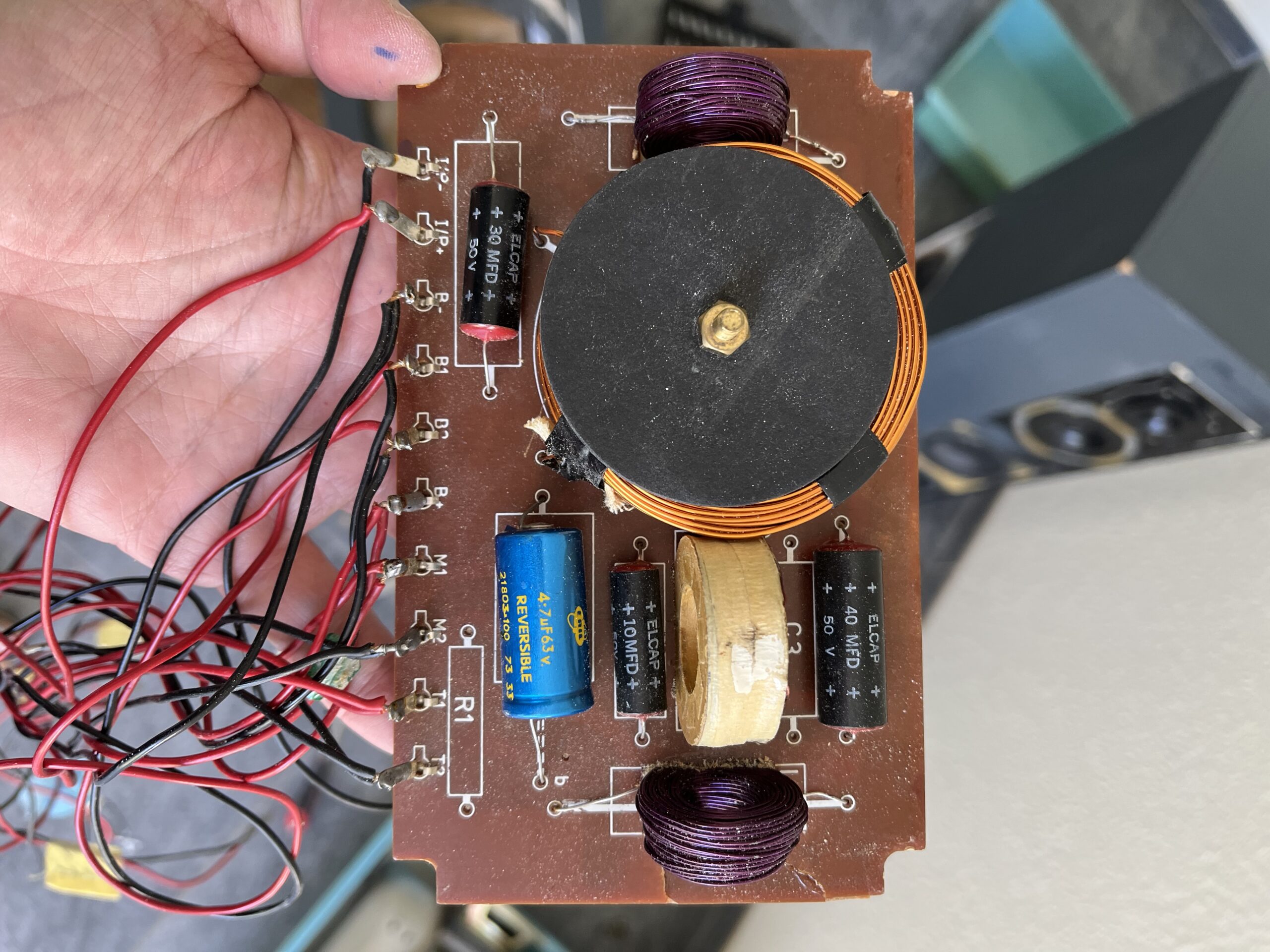 Das Projekt Überarbeitung Goodmans Dimension wurde gestartet. Zielsetzung ein wohnzimmertaugliches Äusseres und eine problemlose technische Funktion. Die Optik sollte mittels Holzfurnier (Nussbaum) erreicht werden, die Höhenproblematik durch einen neuen (gebrauchten) Tweeter ausgebügelt werden (via ebay aus England erledigt). Über das Studium in diversen Foren kam mir der Verdacht, dass nach knapp 50 Jahren vielleicht gar nicht der Tweeter, sondern die Elektronik auf der Frequenzweiche das Problem sein könnte. Beim Betrachten letztgenannter wurde auch offensichtlich, dass der einzige Elektrolytkondensator genau auf den Tweeter abzielt. Ergo wurden zwei (für jede Weiche einer) abgestimmte, hochwertige Ersatzkondensatoren geordert und verbaut.